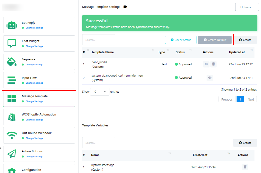 After saving, your newly created template will be listed in the Template section, but its status will initially be marked as `Submitted`. Please be aware that template approval may require some time. Once the template has been reviewed and approved, its status will be updated to `Approved`. Just check the status again to see whether they are approved or not.