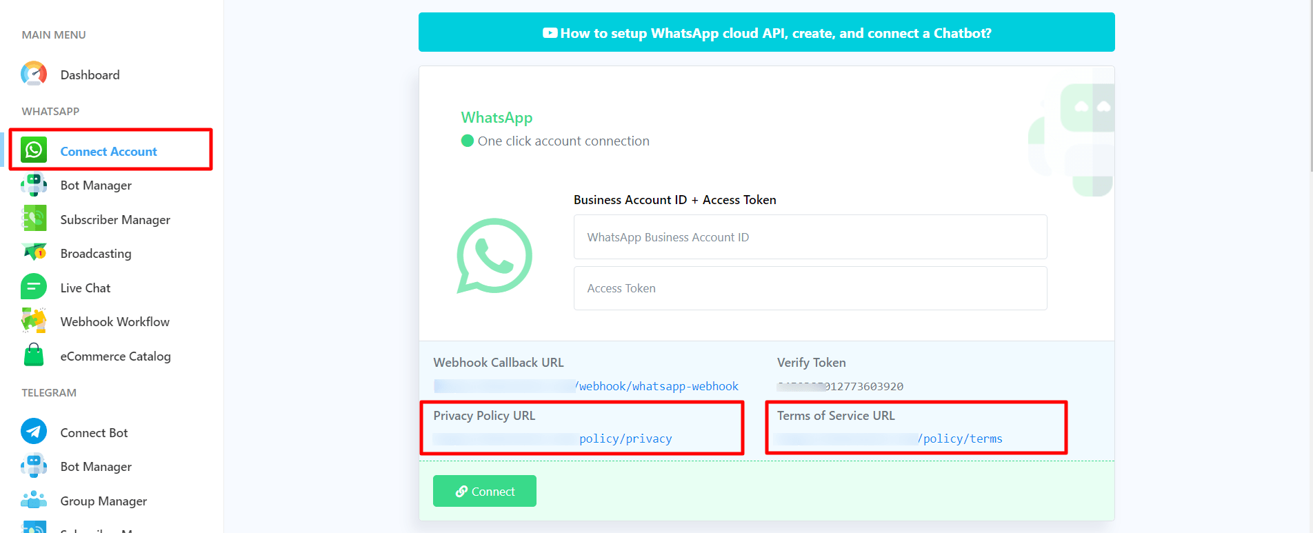 To get the callback URL and verify the token from Efibot. Login to your account and go to the dashboard of Efibot. At the left sidebar of the Dashboard, under the WhatsApp section, you will see connect WhatsApp option. Now click on the connect WhatsApp menu and instantly, Connect WhatsApp Business page will appear.